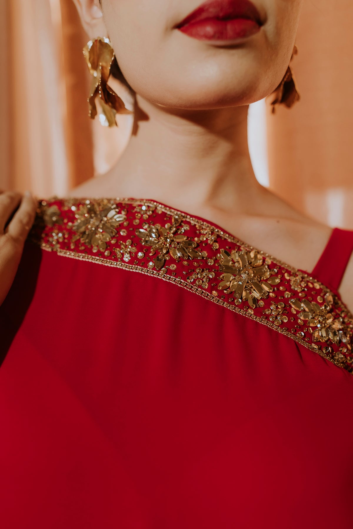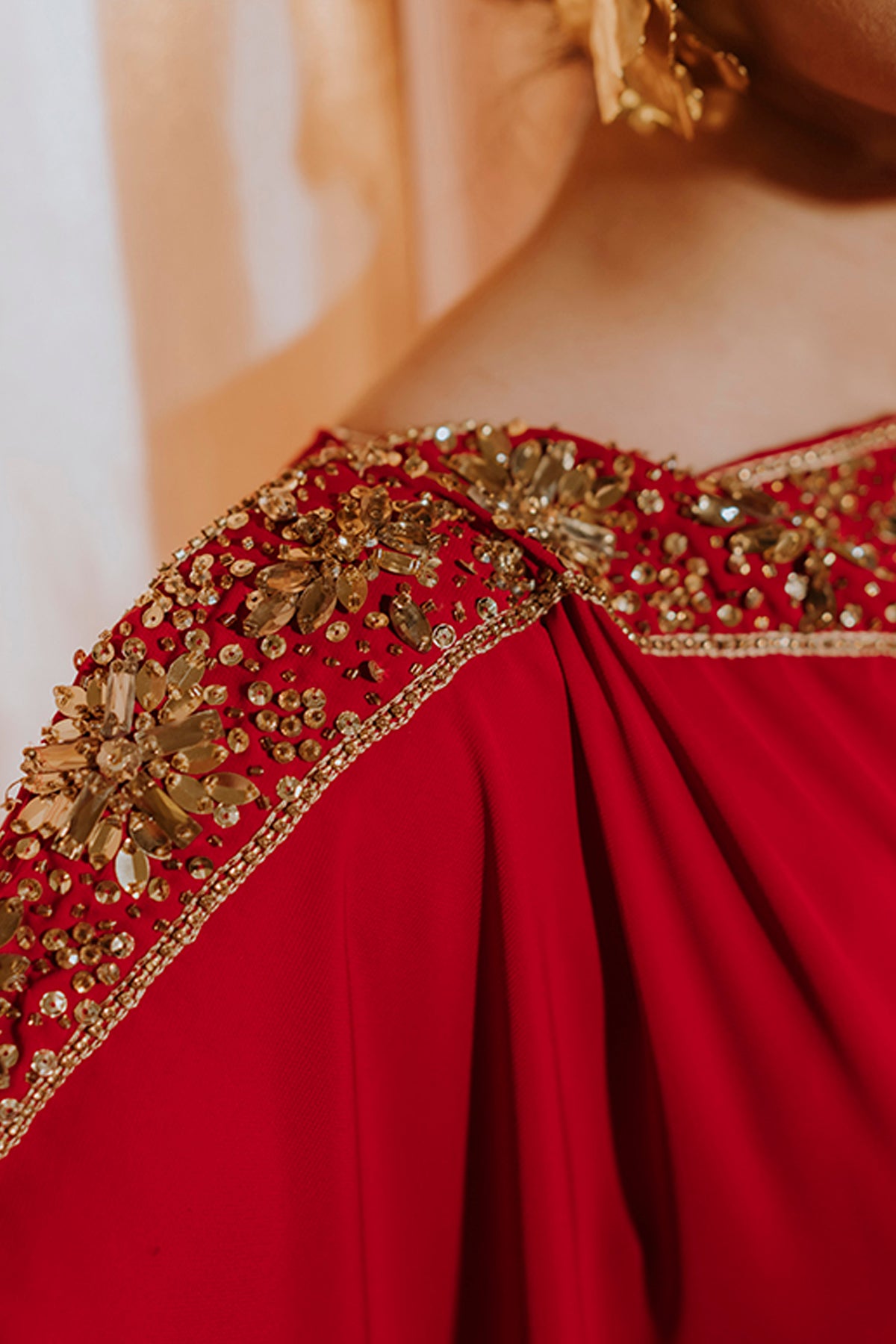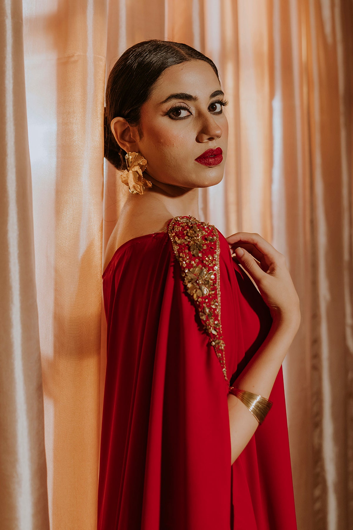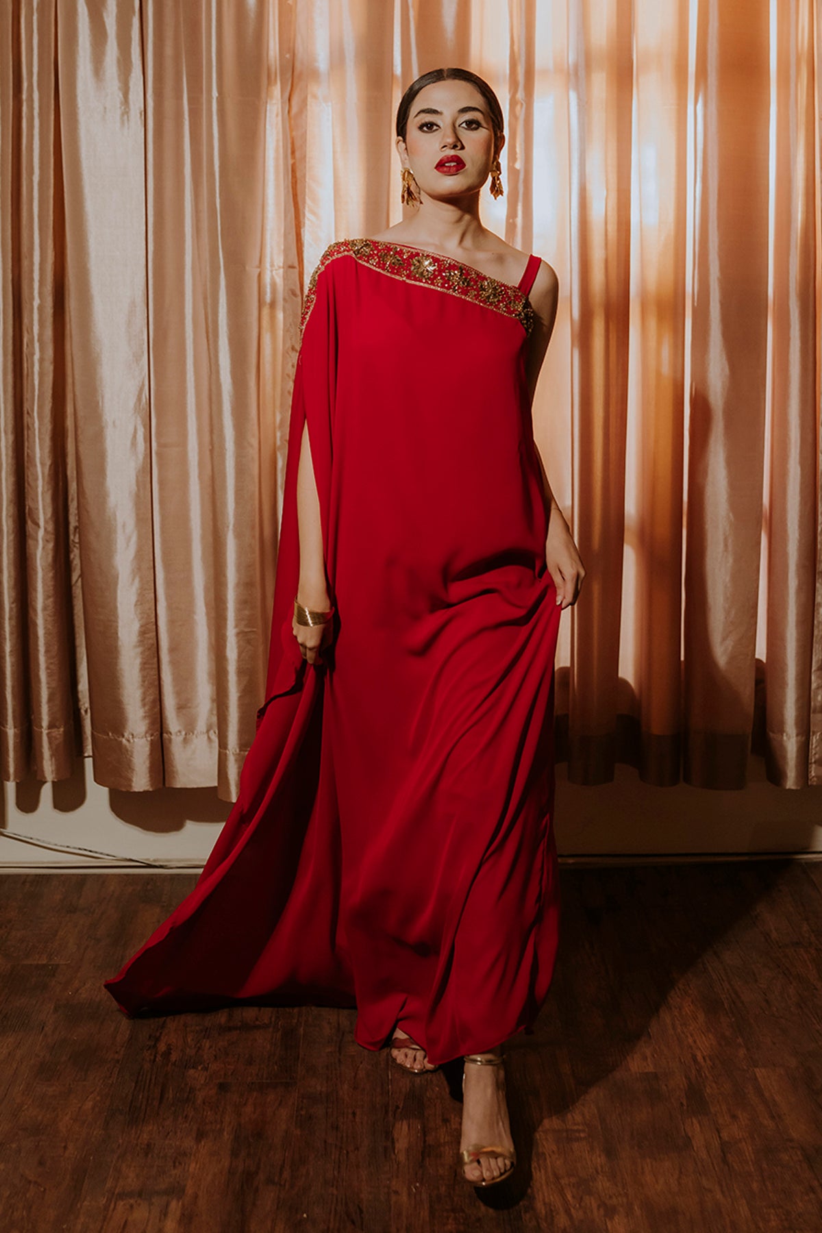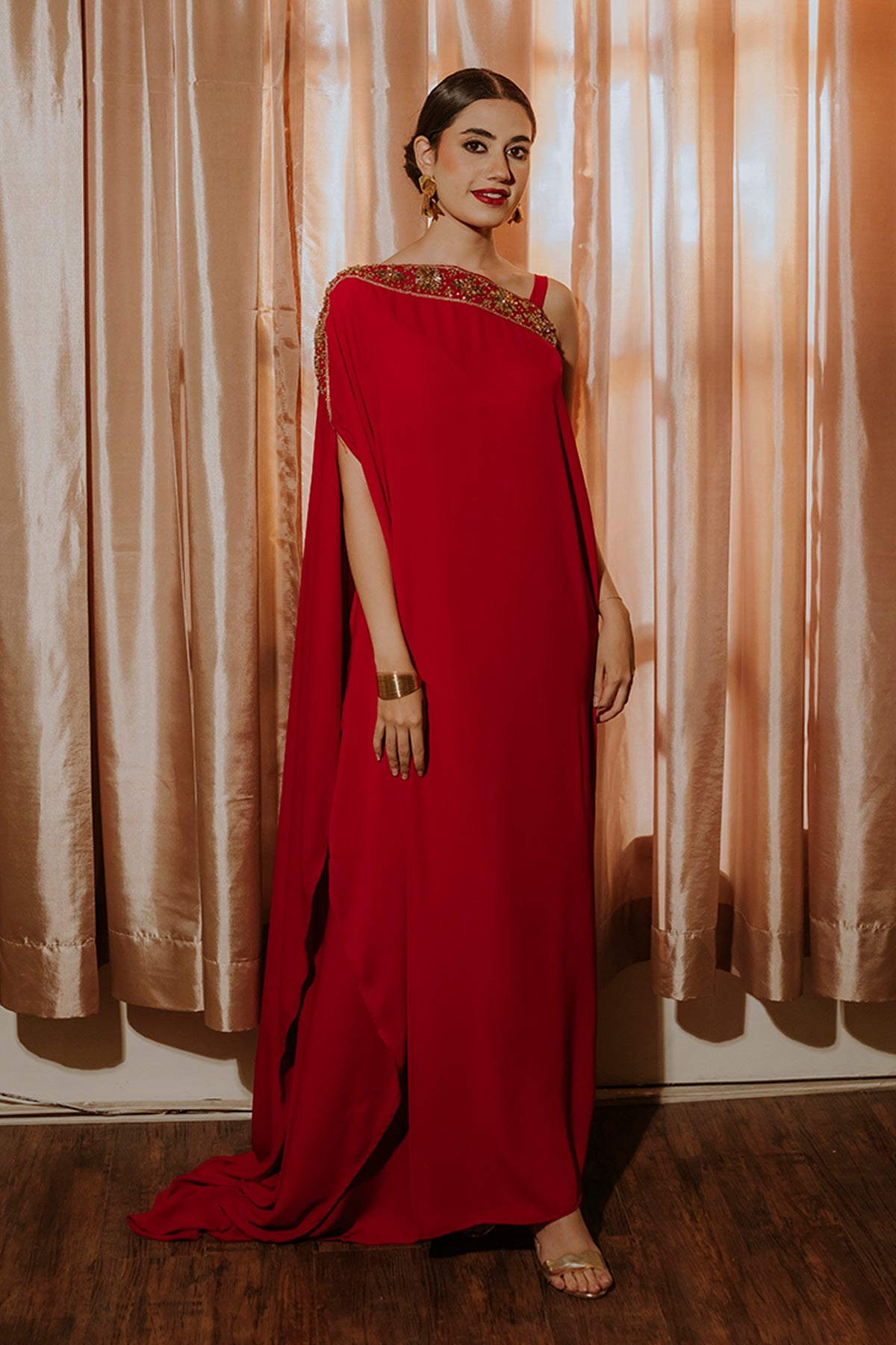 Make a bold style statement with this One-Shoulder Georgette Flared Kaftan, featuring delicate hand-embellished work that adds a touch of glamour to its flowing silhouette. Elegant, modern, and effortlessly chic, this dress is perfect for special occasions where you want to exude confidence and grace.